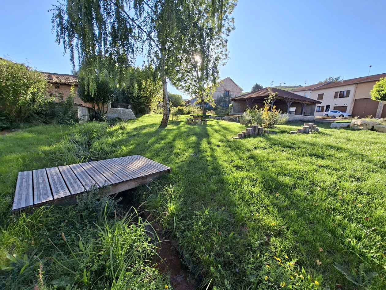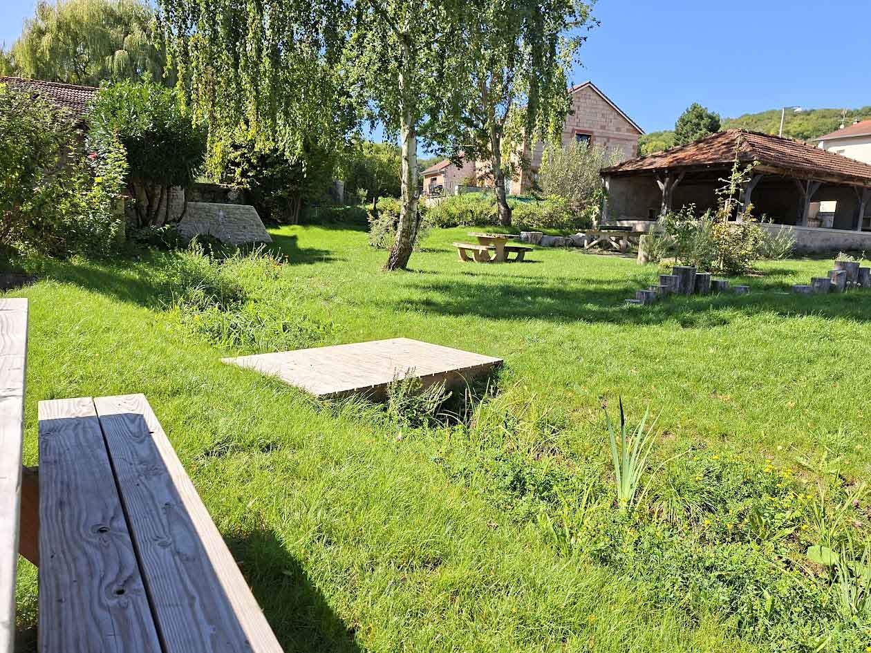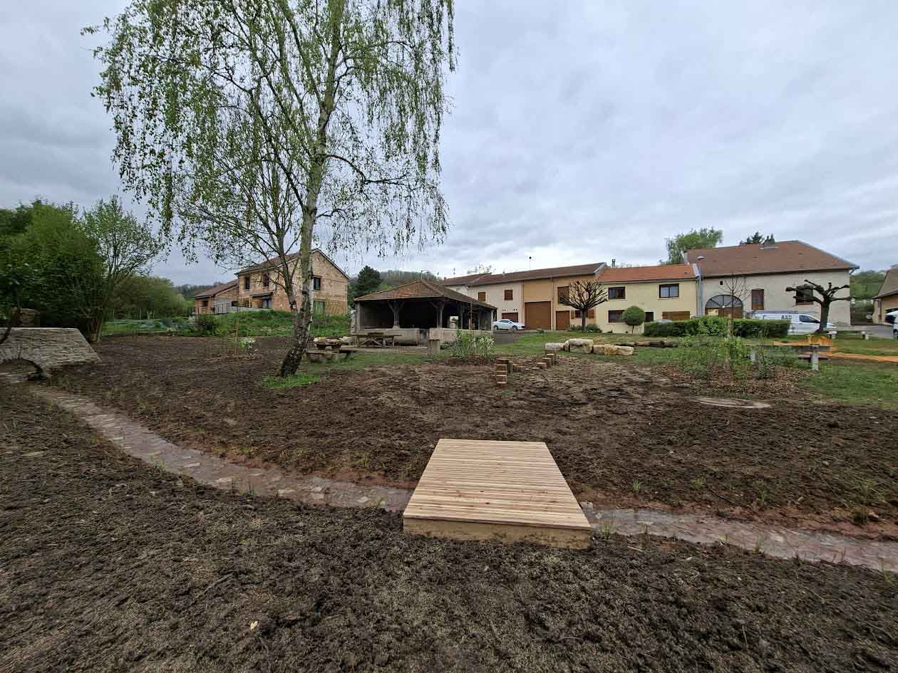 Parallèlement, une passerelle et du mobilier en bois ont été installés pour faciliter les cheminements et les usages quotidiens. La place de village a été renaturée et équipée de jeux conçus en matériaux naturels, tandis que des bosquets champêtres ont été plantés pour structurer l’espace, créer de l’ombre et renforcer les continuités écologiques.